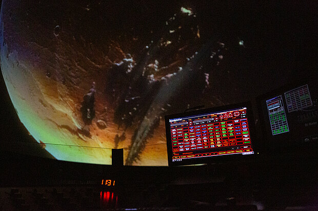 Die 18 Meter große Kuppel mit einer Fläche von rund 510 Quadratmetern wird von sechs Projektoren vollständig bespielt. Jeder Projektor deckt etwa ein Sechstel der Kuppel ab. Zusammen entsteht ein nahtloses Fulldome-Bild mit rund 35 Millionen Pixeln, das den gesamten Raum umhüllt.